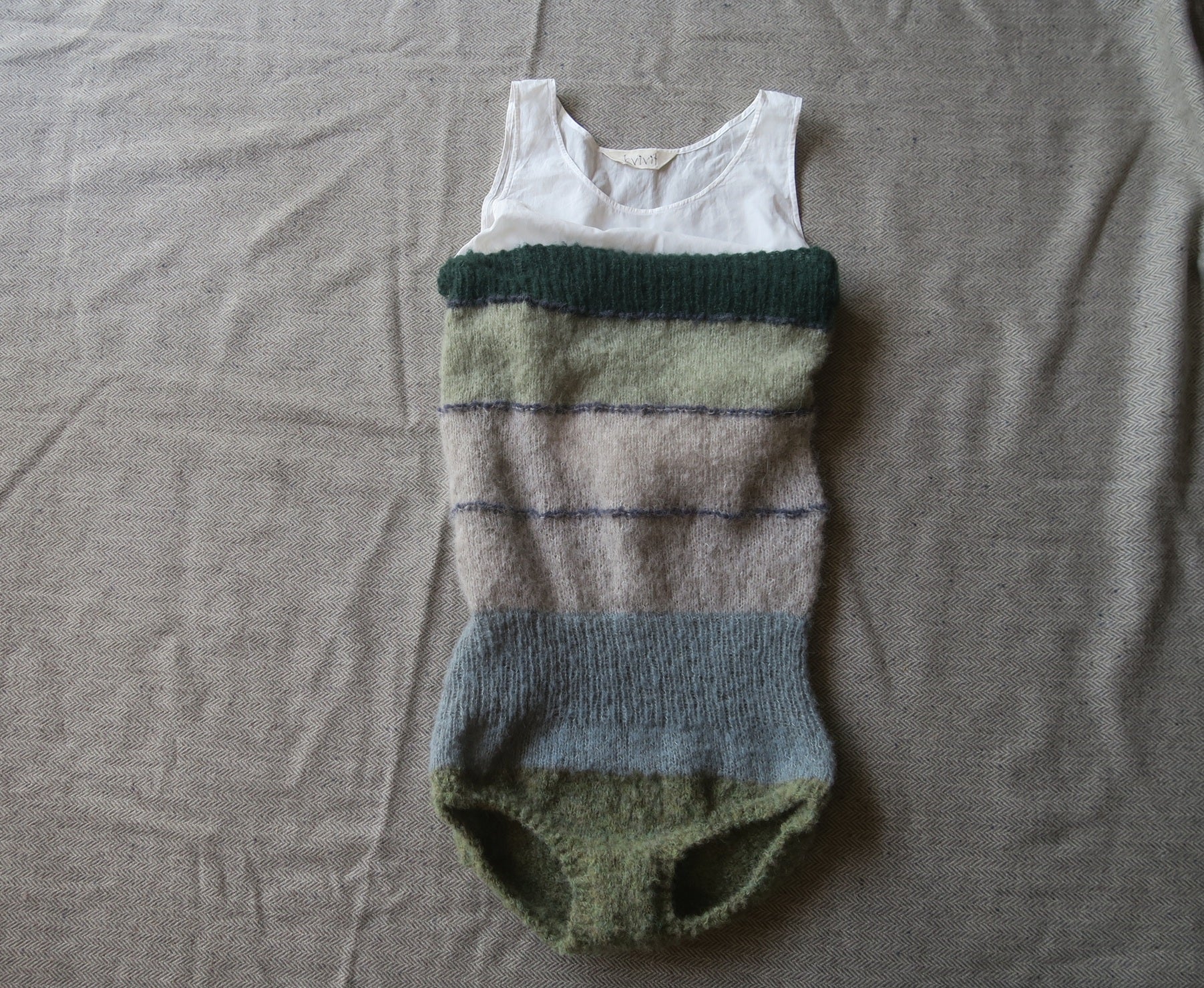 サンプルはつなげて編んでいます(化粧直し時にも着脱できるようにしています)が、ボディ部分とアンダーウエア部分と分けて編んでも。使いやすいですね。